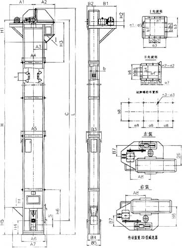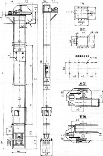 TH型斗提機外形見圖2,其尺寸見表7、驅(qū)動裝置配套及相關尺寸見表9。