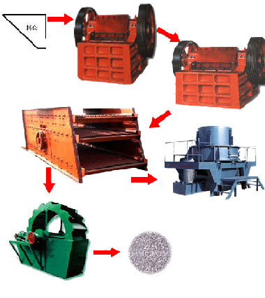 沙石生產(chǎn)線,砂石生產(chǎn)線,砂石生產(chǎn)線設(shè)備,砂石線,砂石生產(chǎn)設(shè)備基本流程:大塊石料經(jīng)料倉由振動給料機(jī)均勻地送進(jìn)鄂式破碎機(jī)進(jìn)行粗碎,粗碎后的石料由皮帶輸送機(jī)送到反擊式破碎機(jī)進(jìn)行進(jìn)一步破碎;不滿足粒度要求的石子由皮帶輸送機(jī)返料送到反擊式破碎機(jī)進(jìn)行再次破碎,形成閉路多次循環(huán)。