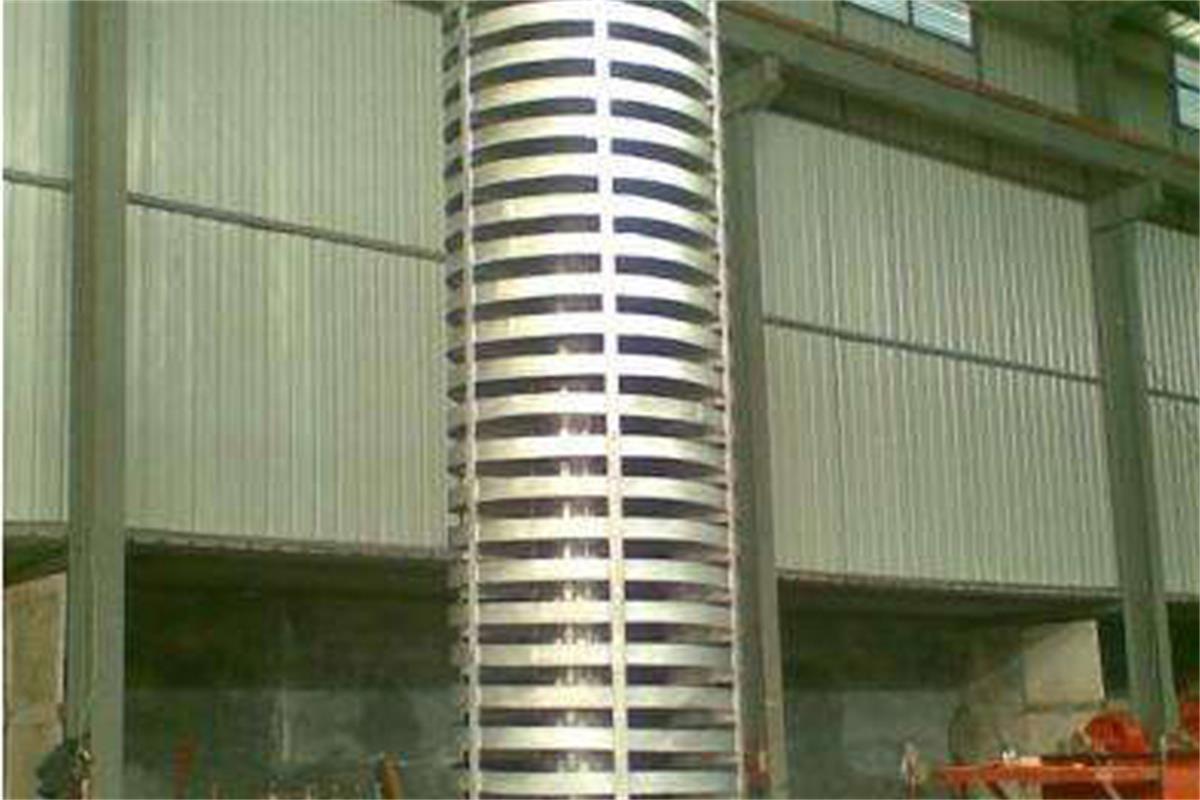 垂直振動輸送機是通過激振器強迫振動,使輸送塔作沿垂直方向的直線振動和繞鉛垂中心軸的扭動振動,兩個振動的合成,使物料朝        螺旋運動的方向斜拋,形成了物料沿螺旋槽向上的輸送過程。垂直振動輸送機是由提升槽、振動電機、減振系統(tǒng)和底座等組成。垂直振動輸送機分開槽式、封閉式兩種結(jié)構。